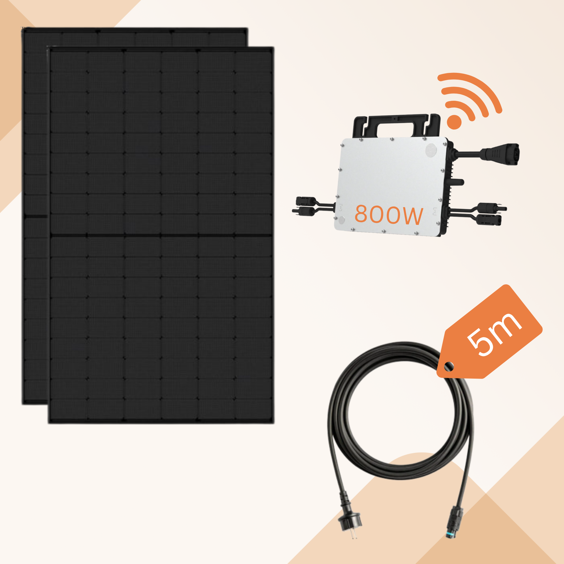 Dieses Set beinhaltet einen Hoymiles 800W Mikro-Wechselrichter und zwei hochwertigste 445W Full Black PV Module mit langen Garantiezeiten. Zudem enthält es ein 5m langes Schuko Anschlusskabel für den einfachen Anschluss an eine Schutzkontaktsteckdose.